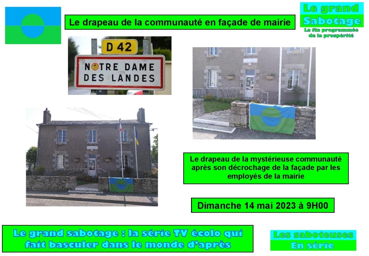 C’est un peu après 9H00, ce dimanche 14 mai 2023, que le drapeau de la mystérieuse communauté a été érigé sur la façade de la mairie de Notre Dame des Landes. Une joggeuse qui était passée devant la mairie vers 8H30 a confirmé ne rien n’avoir remarqué. On estime ainsi que l’installation du drapeau s’est faite aux alentours de 8H45. Les rares témoins présents sur place indiquent avoir vu trois femmes, revêtues de bleus de travail et portant des gants verts, venir avec une échelle pour accrocher le drapeau.