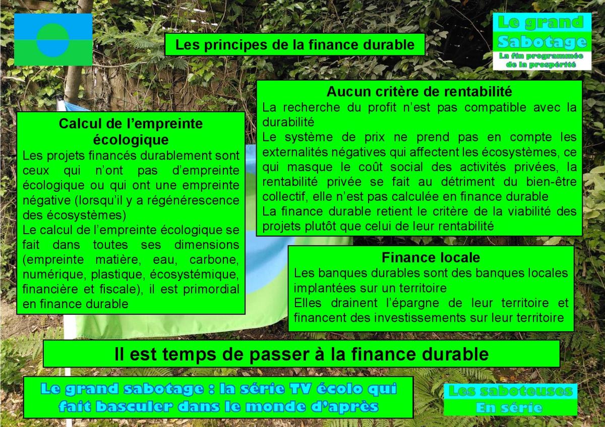 Nathalie (saboteuse en série) : Nous n’avons pas précisé qu’une banque durable n’est pas mondialisée. Sa seule assise est territoriale. Elle collecte l’épargne des habitants d’un territoire, et pas au-delà, et la draine vers des projets qui se situent sur le territoire, et pas au-delà. Ainsi, le risque de greenwashing est très limité car les conséquences des actions de chacun sont connues lorsqu’on se situe à une échelle humaine.