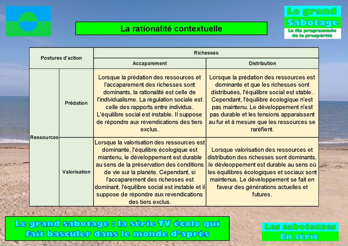 La série « Le grand sabotage » montre comment les habitants d’un territoire instaurent les modalités du développement durable en préservant les écosystèmes et en ponctionnant les ressources de manière durable. Dans les saisons 4 et 5, le développement durable est devenu une réalité et les habitants semblent agir selon une rationalité qui est autre que celle qui prévalait dans le monde d’avant. Explications.